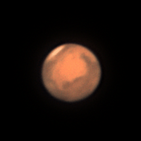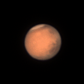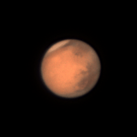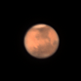Since the length of a Martian day is not very different from our own (approximately 24 hours and 40 minutes), the features visible from a given site on Earth only change slightly from night to night, appearing as a gradual backwards rotation. So one has to observe Mars over a period of weeks to see the entire surface. The above animations show the planet's rotation over approximately half an hour (5 minutes per frame). The North polar cap is prominent in all of the animations. The first two animations on the left also include Olympus Mons (a faint circle visible to the left of center), and the first three animations show Valles Marineris (below a bright triangular peninsula-like feature). The third and fourth animations show the bright Arabia Terra region. The fifth animation shows the bright Elysium Planitia region, as Mars starts to appear noticeably smaller.