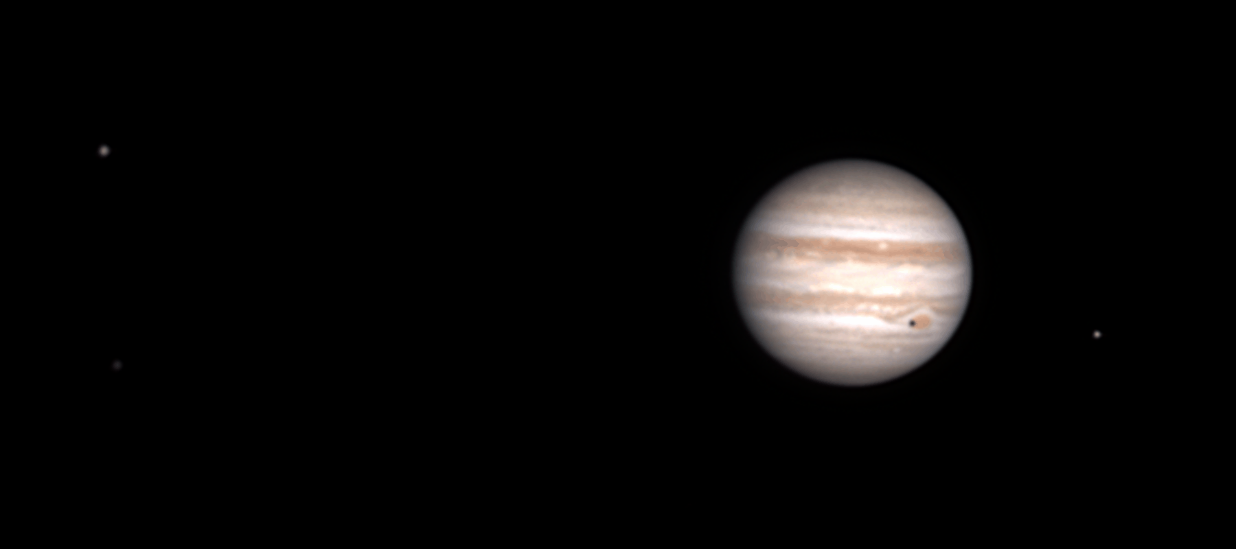 The animation at upper-left covers a time interval of 45 minutes and shows the shadow of the moon Io crossing Jupiter as it rotates. I believe Io is also present to the lower-right of the shadow, but it is difficult to see because it is in front of a reddish-brown band of similar color. The animation at upper-right, acquired from images taken the following day, covers a longer time duration of 200 minutes and shows the eventual emergence of the Great Red Spot. The bottom animation, covering a time interval of 50 minutes, was acquired just after Io had disappeared behind the right edge of Jupiter. It shows Europa to the right of the Jupiter with its shadow crossing the Great Red spot. The left part of the image shows Ganymede (top) and Callisto (bottom).