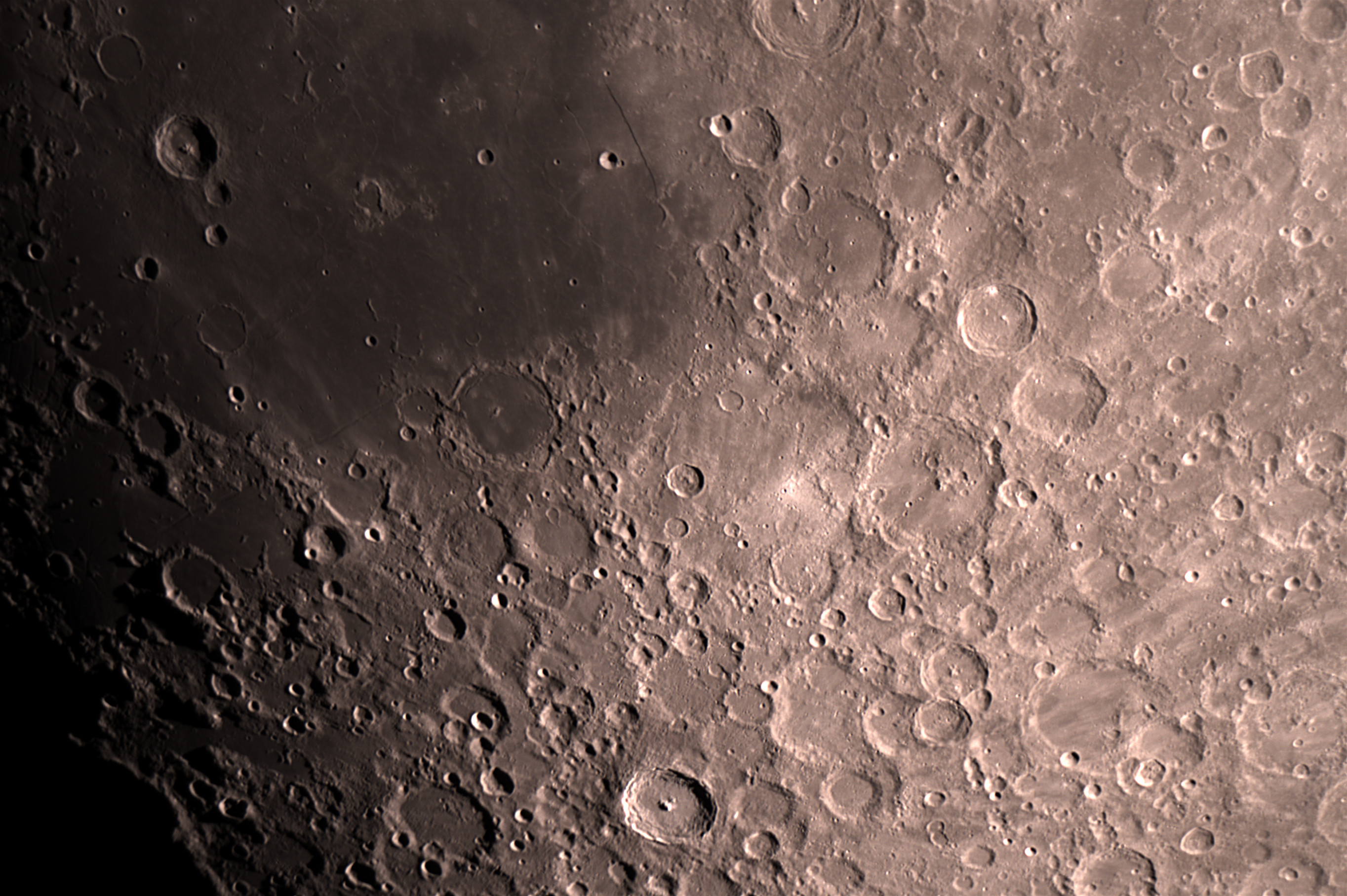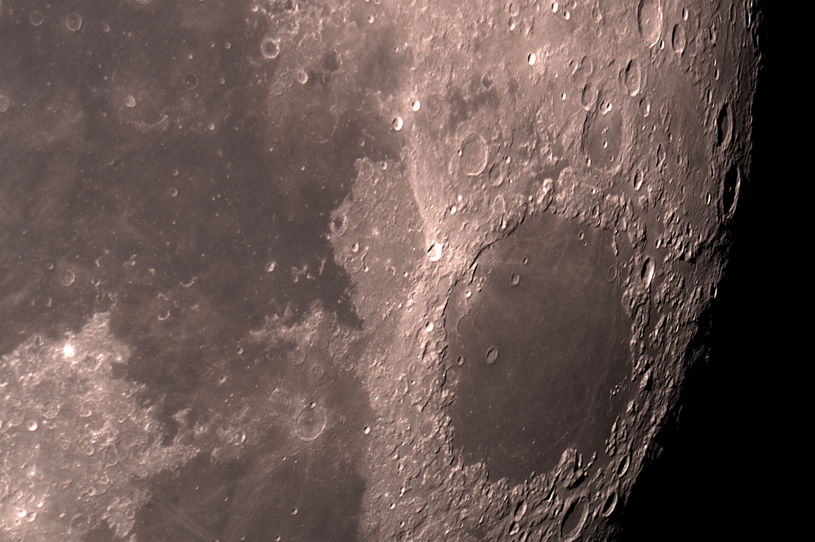 The left image (click to enlarge) shows the Mare Crisium and Mare Tranquillitatis regions of the Moon when it was still close to full. For scale, Mare Crisium (the dark basin towards the right) is approximately 345 miles in diameter. The right image, taken when the Moon was past first quarter, includes Mare Nubium and the Straight Wall (upper-left area), and Tycho, the crater with the large central peak near the bottom of the image.