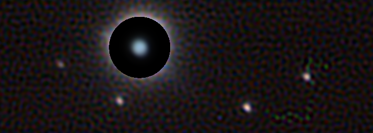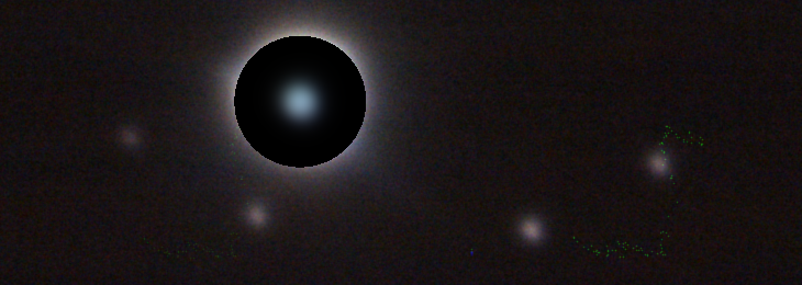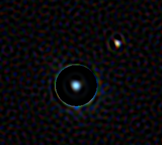 The image on the left was made from a series of 2000 exposures, 0.1s each, by selecting the 200 sharpest images and combining them with Registax. These settings were intended to produce the sharpest image of Uranus. To show the much smaller and fainter moons, the images on the right were made from a series of 100 4-second exposures, stacking the 90 sharpest frames in Python. The top image shows the result without sharpening. The part of the image inside the dark circle is attenuated by a factor of 0.0015, to allow Uranus (magnitude 5.7) to be seen alongside its four brightest moons, from left to right: Umbriel (mag. 14.9), Ariel (mag. 14.1), Titania (mag. 13.9), and Oberon (mag. 14.1). The bottom image was sharpened by deconvolution using a Gaussian-type kernel. The green debris towards the right is from a hot pixel on the sensor. Its trajectory is the result of telescope tracking errors.