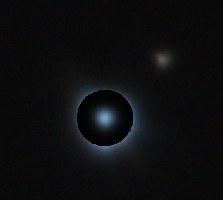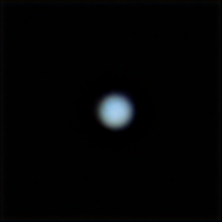 The image on the left was made from a series of 500 exposures, 0.1s each, by selecting the 50 sharpest images and combining them with Registax. These settings were intended to produce the sharpest image of Neptune, though my expectations were low due to Neptune's small angular size and low position in the sky. To show Neptune's moon Triton, the images on the right were made from a series of 100 4-second exposures, stacking the 90 sharpest frames in Python. The center image shows the result without sharpening. The part of the image inside the dark circle is attenuated by a factor of 0.015, to allow Neptune (magnitude 7.9) to be seen alongside Triton (mag. 13.8). The image on the right was deconvolved using a Gaussian-type kernel.