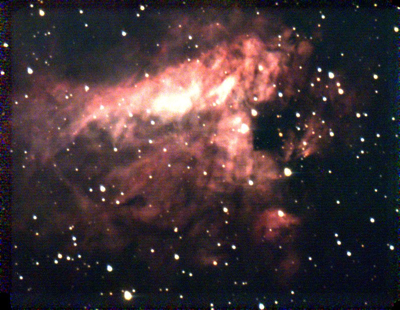 This is a new image of M17 taken with the ST-4K camera. Although the image is not quite as sharp as the previous image obtained with the Starshoot camera, it covers a much larger area and shows fainter features. The ST-4K camera also shows the hydrogen-alpha emission (red features) more brightly relative to dust (blue-white features).