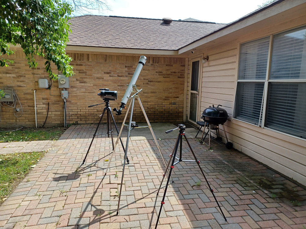 Because of a rental car shortage, we viewed the eclipse from the back yard of the house where we stayed. We were approximately halfway from the center to the edge of the path of totality, but based on simple math I only expected this to reduce the totality duration by ~13%. For a number of days before the eclipse, the weather forecasts predicted a high chance of both low-level and high-level clouds, so we were not optimistic as the time approached. Monday, April 8 started out cloudy in the morning, but the clouds started to show breaks by the time the partial eclipse started. As more of the sun was blocked, the clouds dissipated entirely. So we were quite fortunate and had an unobstructed view during totality. The clouds started to appear again as the partial eclipse neared its end.