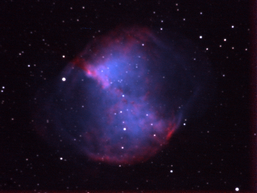 I acquired this image from our patio while testing the Python tracking software. There was a mistake in the shutter control, so that the shutter was closed in between the guiding exposures, so it was only open about 40% of the time. However, the seeing was good that night, so it ended up being the sharpest image I had taken of M27 so far.